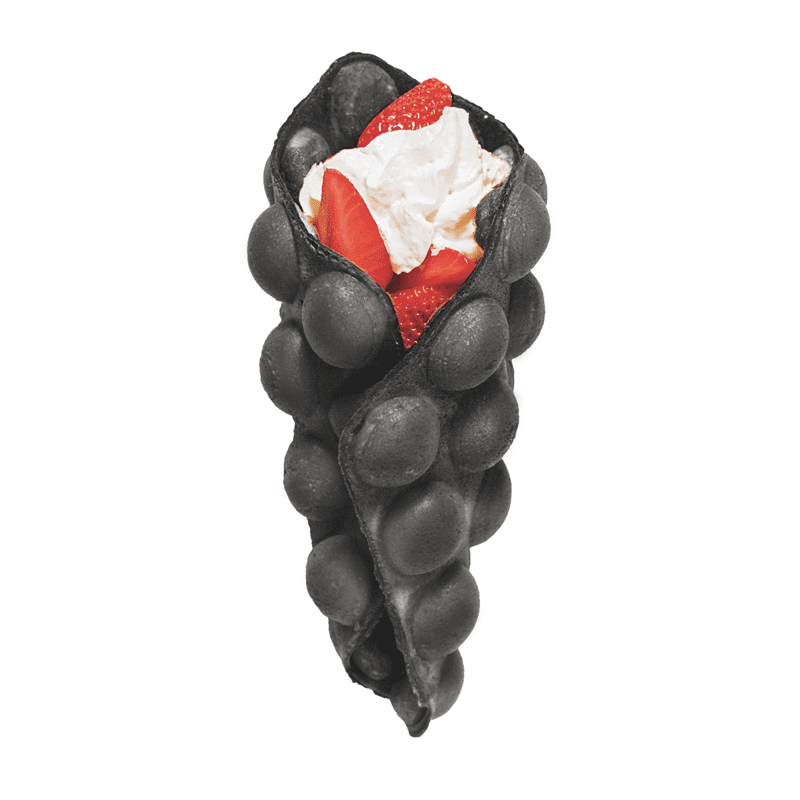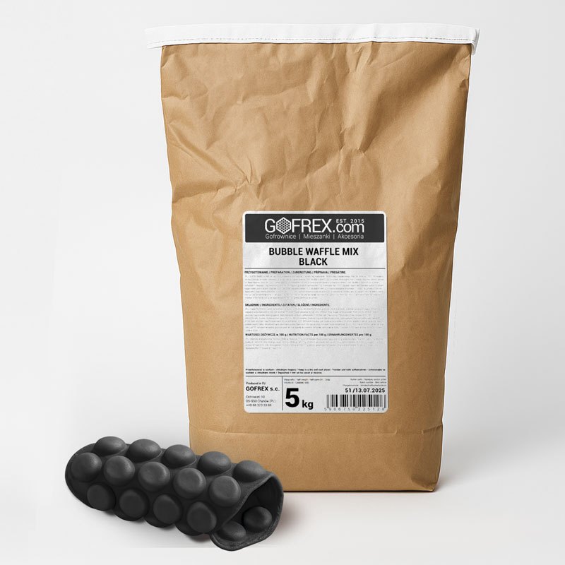 Těsto na černé bublinkové wafle Bubble Waffle od společnosti Gofrex je pečlivě vyvinutá směs určená k přípravě efektních, černých hongkongských vaflí. Produkt se vyznačuje unikátní černou barvou, která je dosažena použitím páleného kokosového vlákna — přírodního barviva široce využívaného v potravinářském průmyslu. Suroviny nejvyšší kvality zajišťují křupavou kůrku a měkký střed, což umožňuje snadné tvarování tradičních vaflí nebo kornoutů na zmrzlinu a dezerty.