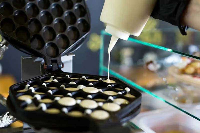 Bubble Waffeln werden an Ort und Stelle, unmittelbar vor dem Servieren, gebacken, da der Teig dazu neigt, schnell auszuhärten. Die Waffeln können noch warm zu Tüten geformt werden. Sie können also nicht im Voraus zubereitet werden, sondern sind immer frisch, was ihren Charme ausmacht.