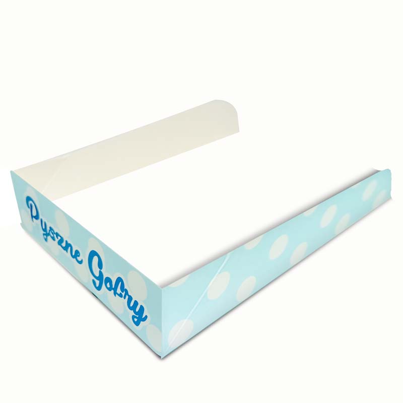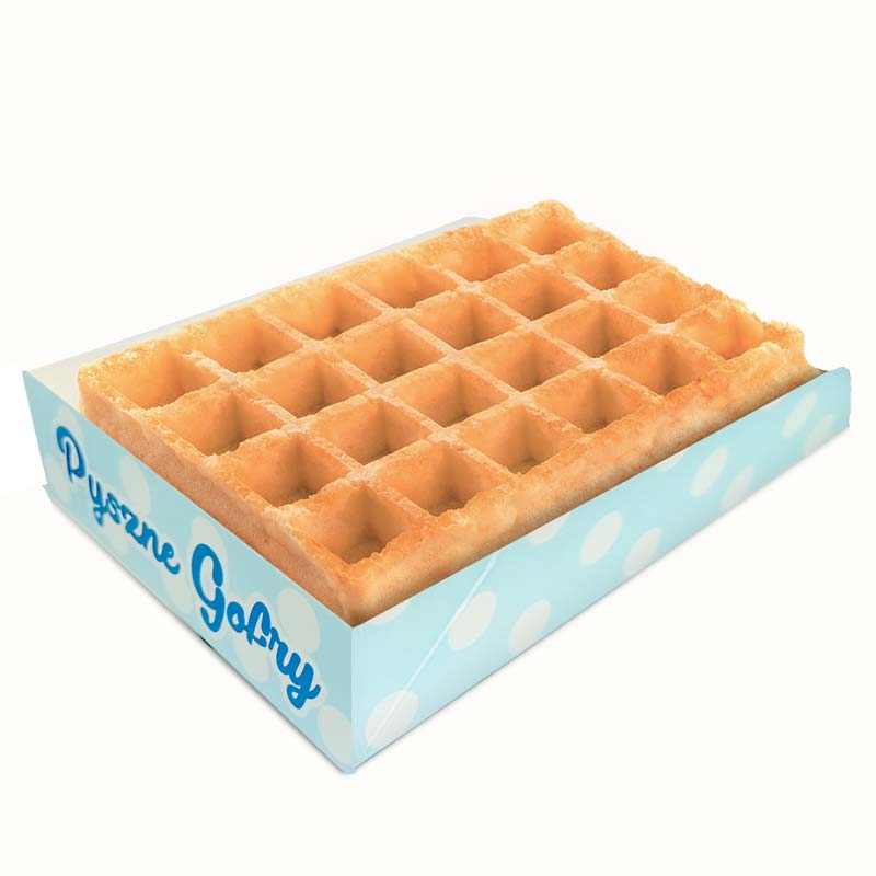 Belgische Waffelschalen aus Karton, bedruckt in Blau mit weißen Erbsen und der Aufschrift „Leckere Waffeln“. Die Neuartigkeit der Kartonverpackung sorgt dafür, dass das Dessert in seiner ursprünglichen Form serviert wird. Die farbenfrohe Verpackung zieht die Aufmerksamkeit der Kunden auf sich und macht das servierte Gericht interessanter. Der Karton ist für die Verwendung in der Gastronomie zugelassen. Die dicke Pappschachtel sorgt für Wärmedämmung, so dass das Produkt auch Kindern bedenkenlos serviert werden kann.