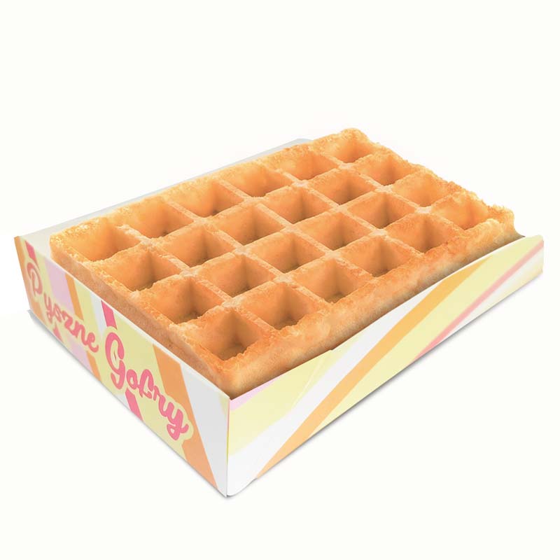 Trays Belgian Waffles cardboard box with multicolor printing and the inscription “Delicious Waffles”. A novelty in the form of cardboard packaging, will ensure that the dessert is served in its original form. Colorful packaging attracts the attention of customers and adds an interesting character to the served dish. Cardboard is approved for use in catering. The thick cardboard box provides thermal insulation, so the product can be served to children without fear.