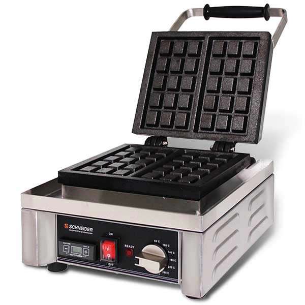 Wysokiej klasy gofrownica profesjonalna niemieckiej marki Schneider-GMBH z żeliwnymi płytami i zegarem oraz manualną regulacją temperatury w zakresie 60-300°C. Wysoką wydajność zapewniają grube płyty żeliwne o dużej pojemności cieplnej oraz grzałki dwie grzałki o mocy 800W każda.