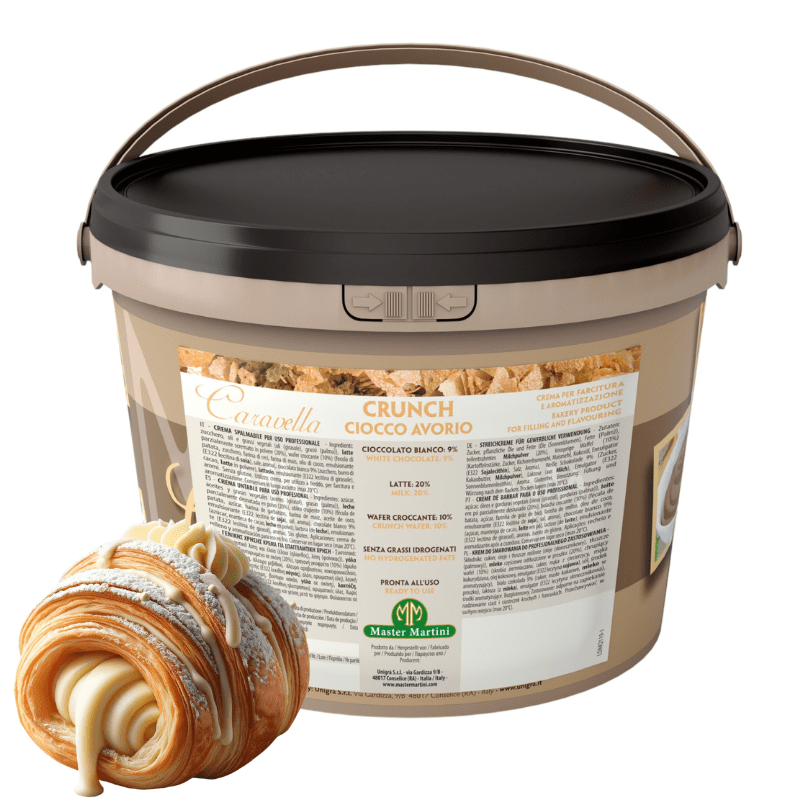 Crema Crunch Ciocco Avorio de la Master Martini este o propunere unică pentru toți iubitorii de dulciuri, combinând moliciunea ciocolatei albe cu crocantul fulgilor de napolitană. Creat în Italia din cele mai bune ingrediente disponibile, produsul oferă o experiență gustativă unică, care va pune în valoare orice desert.