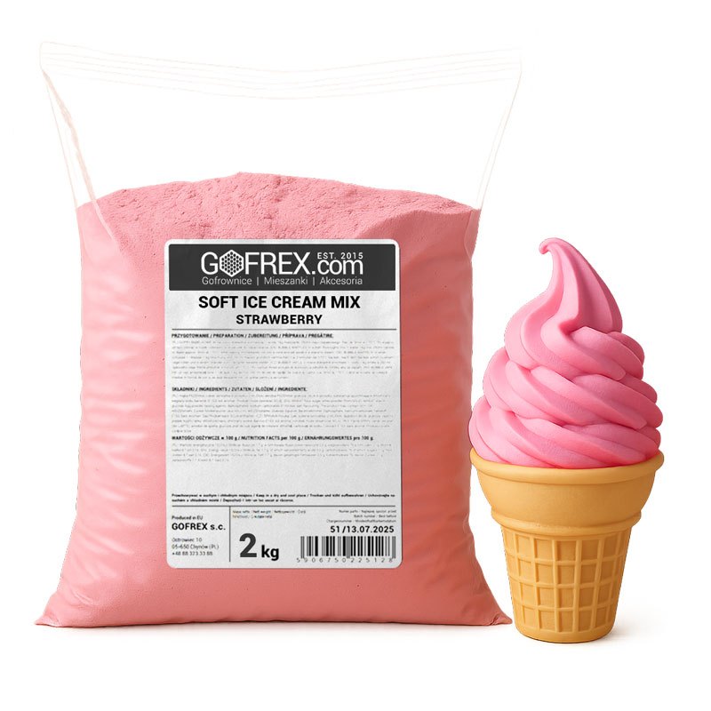 Baza profesională pentru înghețată cu căpșuni Premium de la Gofrex permite producerea autenticei înghețate italiene cu o textură caracteristică, catifelată. Amestecul de bază conține ingrediente lactate selecționate, colorant natural din sfeclă și arome de căpșuni care asigură un gust intens. Produsul este destinat în principal industriei gastronomice, gelateriilor și punctelor de vânzare a înghețatei tip soft.