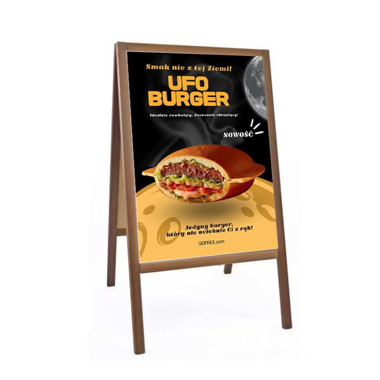 oferă o soluție eficientă pentru unitățile de catering care doresc să crească vizibilitatea și să atragă clienți interesați de tendințele culinare moderne. Formatul B2 se potrivește pe standurile publicitare standard, permițând expunerea în zonele cu trafic intens. Destinat industriei fast-food, restaurantelor și altor unități de catering, afișul sprijină promovarea tendinței burgerilor UFO.