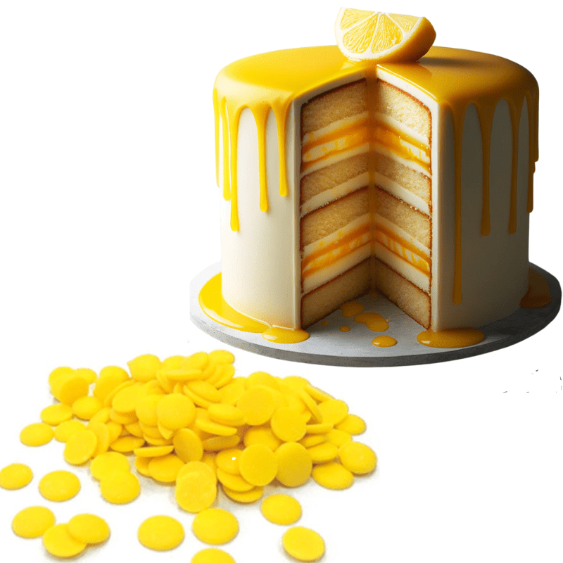 Глазур для тортів і тістечок зі смаком лимона 150 г диски з натуральними барвниками та ароматизаторами. Високоякісний продукт з відмінною текучістю, продукт не містить гідрогенізованих жирів. Ідеально підходить для оздоблення, начинки, додавання до тортів, кремів, ганашів, як пластичний шоколад. Температура плавлення 45°С.